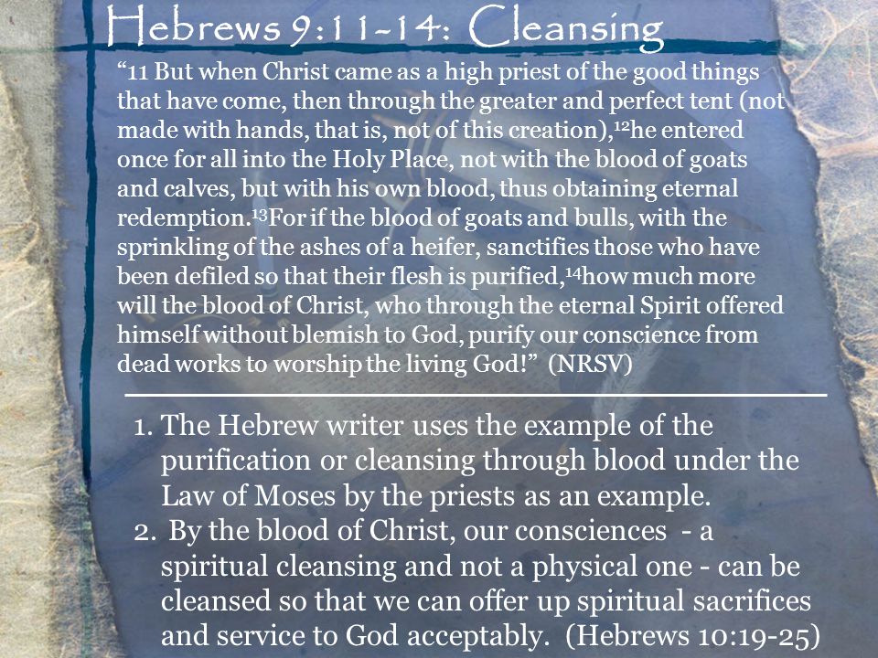 11 But when Christ came as a high priest of the good things that have come, then through the greater and perfect tent (not made with hands, that is, not of this creation),12he entered once for all into the Holy Place, not with the blood of goats and calves, but with his own blood, thus obtaining eternal redemption.13For if the blood of goats and bulls, with the sprinkling of the ashes of a heifer, sanctifies those who have been defiled so that their flesh is purified,14how much more will the blood of Christ, who through the eternal Spirit offered himself without blemish to God, purify our conscience from dead works to worship the living God! (NRSV) The Hebrew writer uses the example of the purification or cleansing through blood under the Law of Moses by the priests as an example. By the blood of Christ, our consciences – a spiritual cleansing and not a physical one – can be cleansed so that we can offer up spiritual sacrifices and service to God acceptably. (Hebrews 10:19-25)