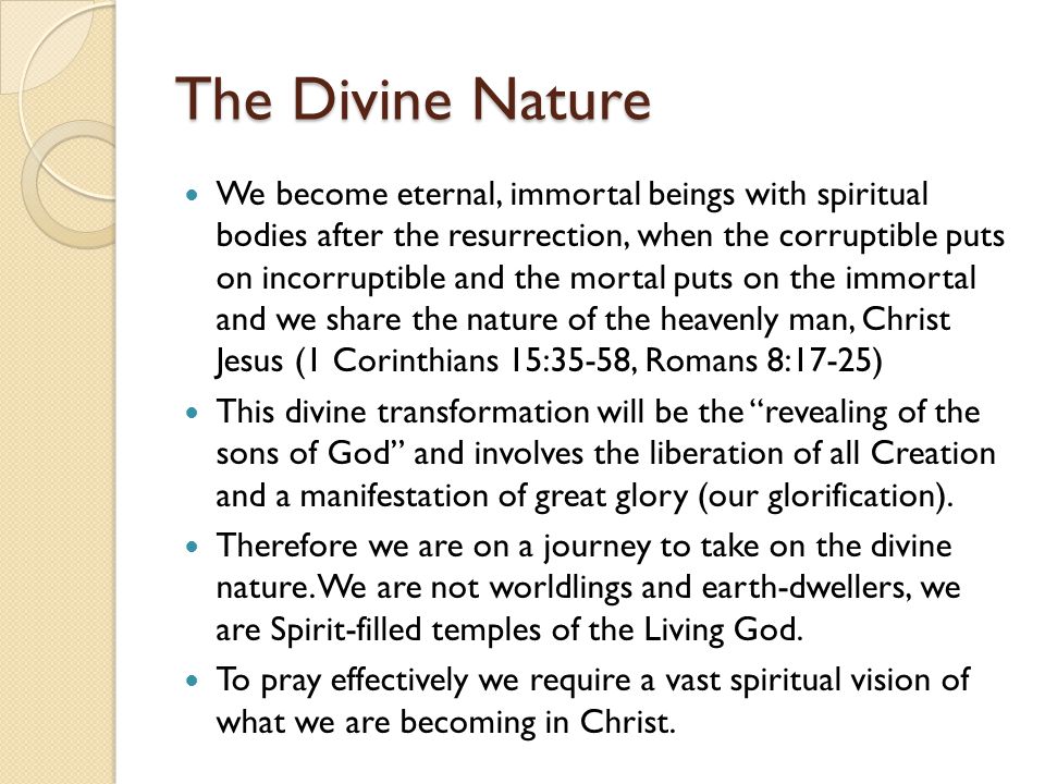 We become eternal, immortal beings with spiritual bodies after the resurrection, when the corruptible puts on incorruptible and the mortal puts on the immortal and we share the nature of the heavenly man, Christ Jesus (1 Corinthians 15:35-58, Romans 8:17-25) This divine transformation will be the revealing of the sons of God and involves the liberation of all Creation and a manifestation of great glory (our glorification). Therefore we are on a journey to take on the divine nature. We are not worldlings and earth-dwellers, we are Spirit-filled temples of the Living God. To pray effectively we require a vast spiritual vision of what we are becoming in Christ.