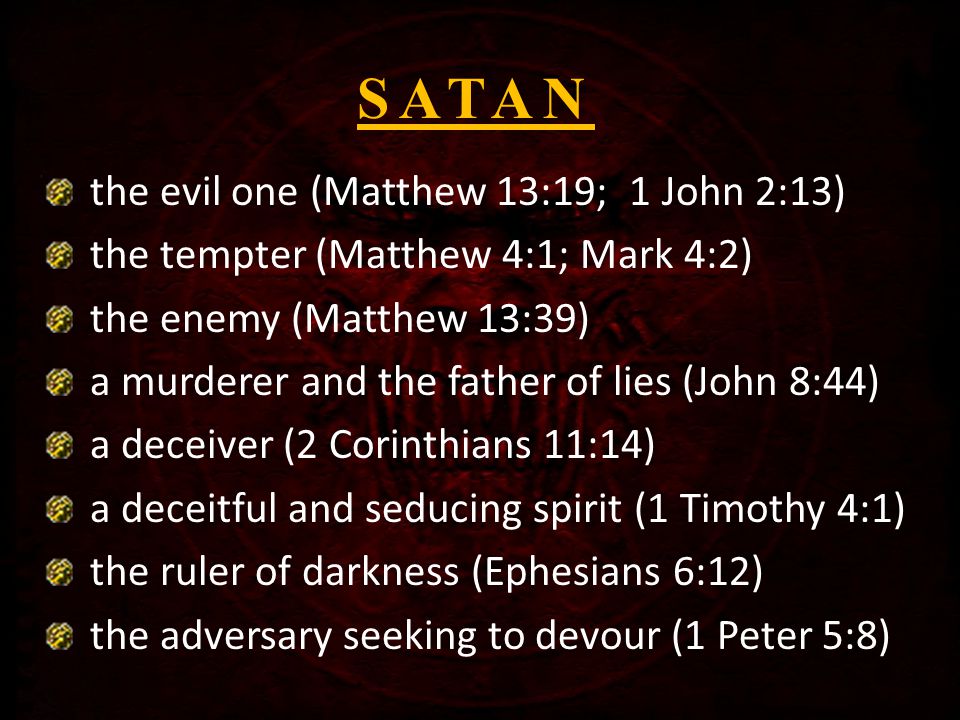 the tempter (Matthew 4:1; Mark 4:2) the enemy (Matthew 13:39) a murderer and the father of lies (John 8:44) a deceiver (2 Corinthians 11:14) a deceitful and seducing spirit (1 Timothy 4:1) the ruler of darkness (Ephesians 6:12) the adversary seeking to devour (1 Peter 5:8)